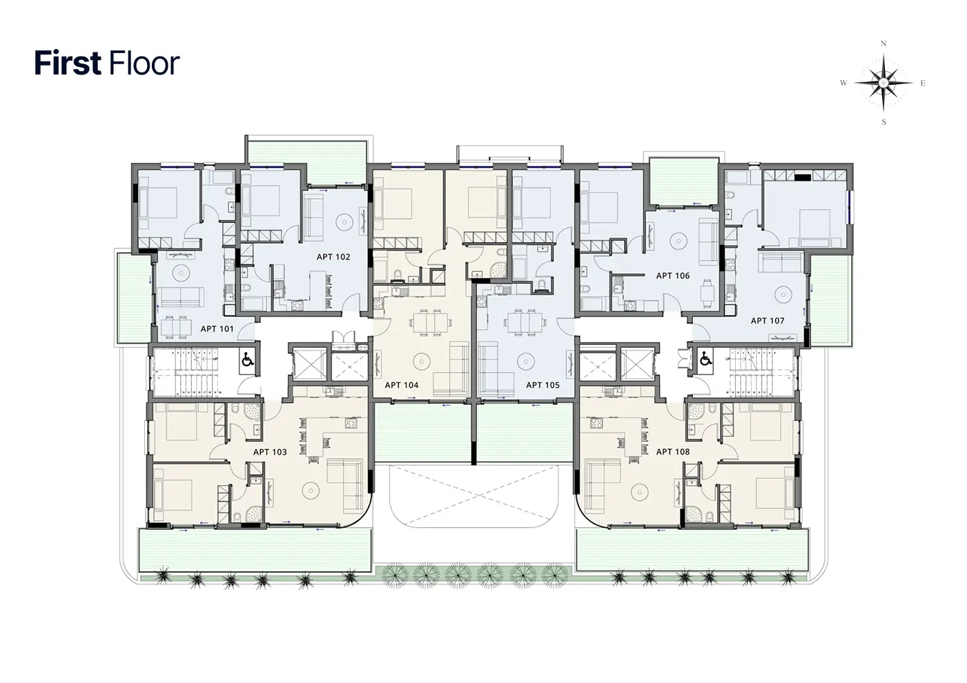 Apartment 102 is a refined one-bedroom, one-bathroom residence offering 52 m² of internal space, opening onto a generous 12 m² covered veranda. The slightly expanded layout enhances everyday living, with a well-proportioned open-plan kitchen and living area designed to maximise natural light and flow.