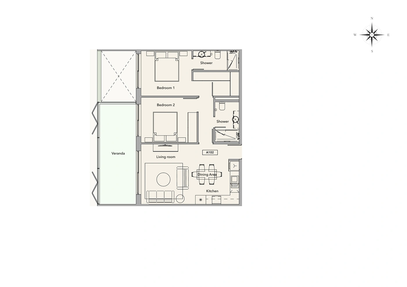 Positioned on the garden level with a tranquil west-facing aspect, A002 delivers a lifestyle rooted in privacy, comfort, and natural surroundings. Its 73.8 m² interior is arranged for balanced modern living, while the 14.4 m² covered veranda extends the living area into soft afternoon light and landscaped greenery.