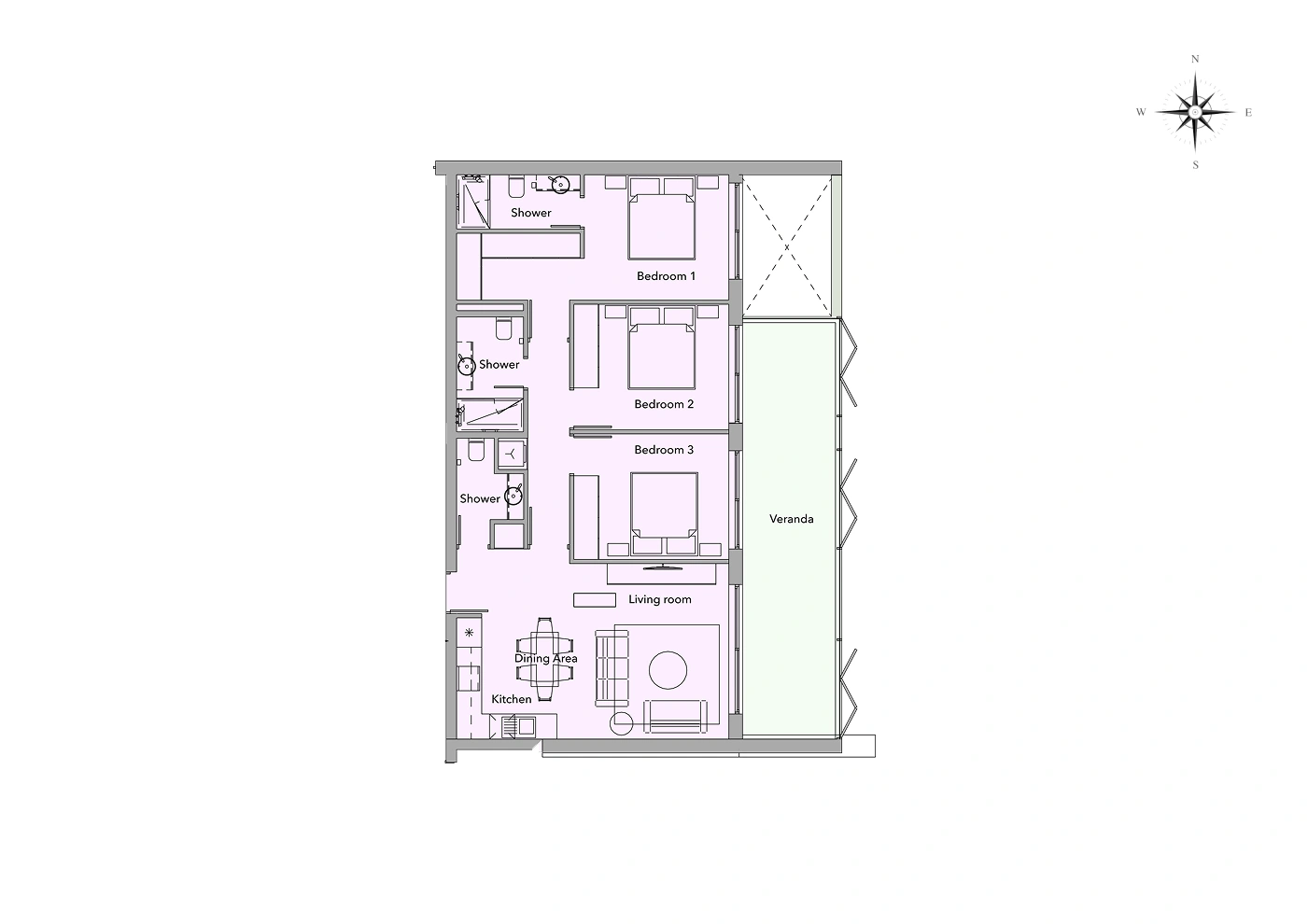 D003 is a standout three-bedroom residence that brings house-like proportions to an apartment setting. Its generous 99 m² interior offers spacious living areas, ideal bedroom separation, and a sense of openness rarely found in boutique developments. The 21.6 m² veranda enhances daily life with east-facing views across landscaped gardens, making it perfect for family dining, play, or relaxation.