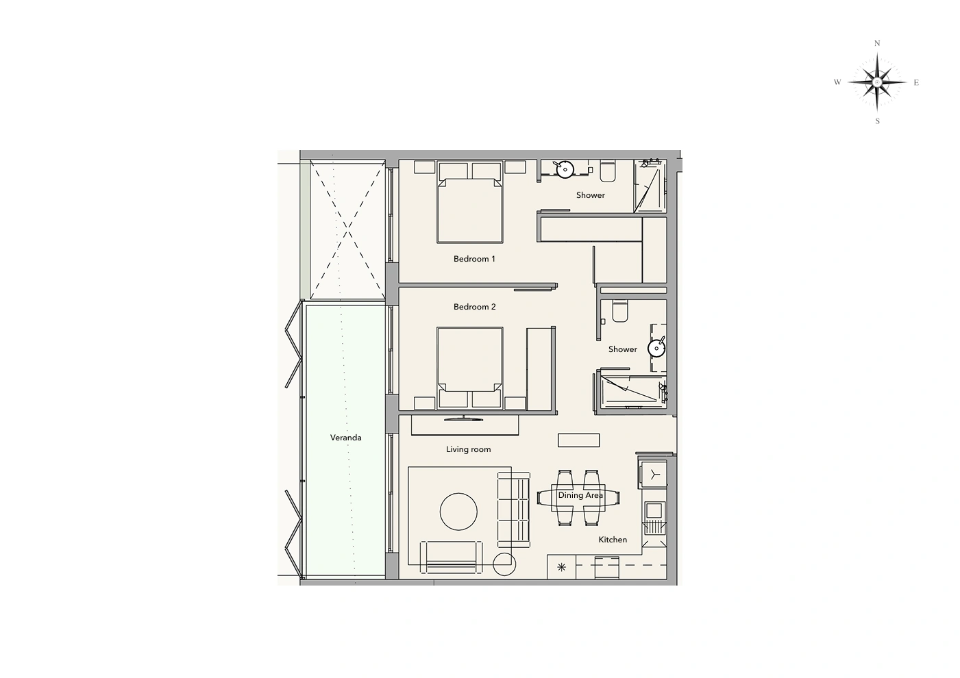 Offering 74 m² of interior space and a 14.4 m² west-facing veranda, D005 provides a harmonious blend of morning brightness and peaceful garden views. Its layout is crafted for modern living, with well-defined rooms and smooth transitions between indoor and outdoor spaces.